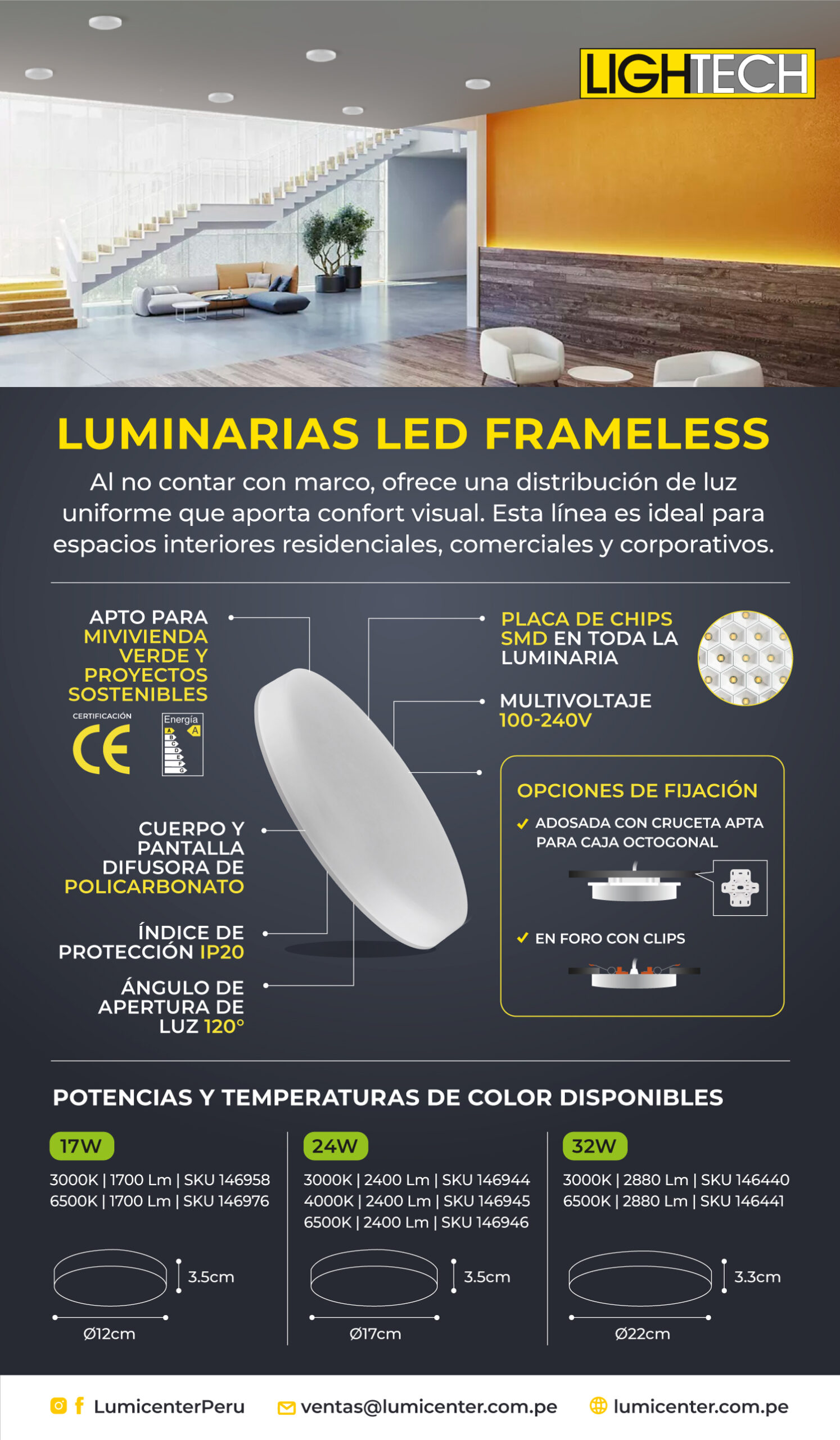 Ilumina tus espacios con el Downlight LED fijo circular de 24W, ideal para empotrar en techos de interiores comerciales y residenciales. Con tres temperaturas de color seleccionables y alta eficiencia energética, ofrece encendido instantáneo y una vida útil prolongada. Perfecto para oficinas, hoteles, hospitales y más.