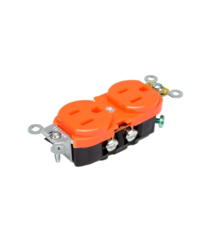 - Tomacorriente doble 2x15A+T para 125/250V. Cuerpo de termoplástico de color naranja bajo la norma NEMA 5-15R. Conexión con todos los enchufes que cumplan la norma NEMA 5-15P. Se recomienda para su instalación conductores de 2.5 a 6mm2. Aplicación: uso industrial.